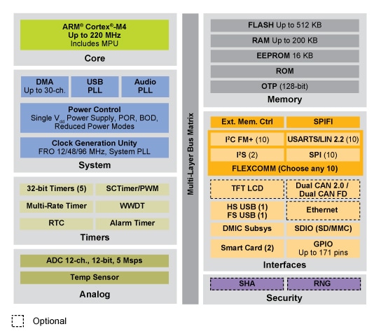 | Description | NXP Semiconductors LPC540 32-bit Microcontrollers combine a 180MHz Arm® Cortex®-M4 core with a power-efficient and unique architecture, advanced HMI, and flexible communication peripherals, delivering real-time performance for next-generation IoT applications. Featuring flexibility with a quad SPI flash interface, CAN, graphic LCD and up to 11 channels for FlexComm, LPC540 MCUs provide the ability to adapt as requirements change. Compatibility within the series enables the LPC540 MCU family to provide a seamless migration path for increasing processing power and adding the flexibility of additionally advanced peripherals. |